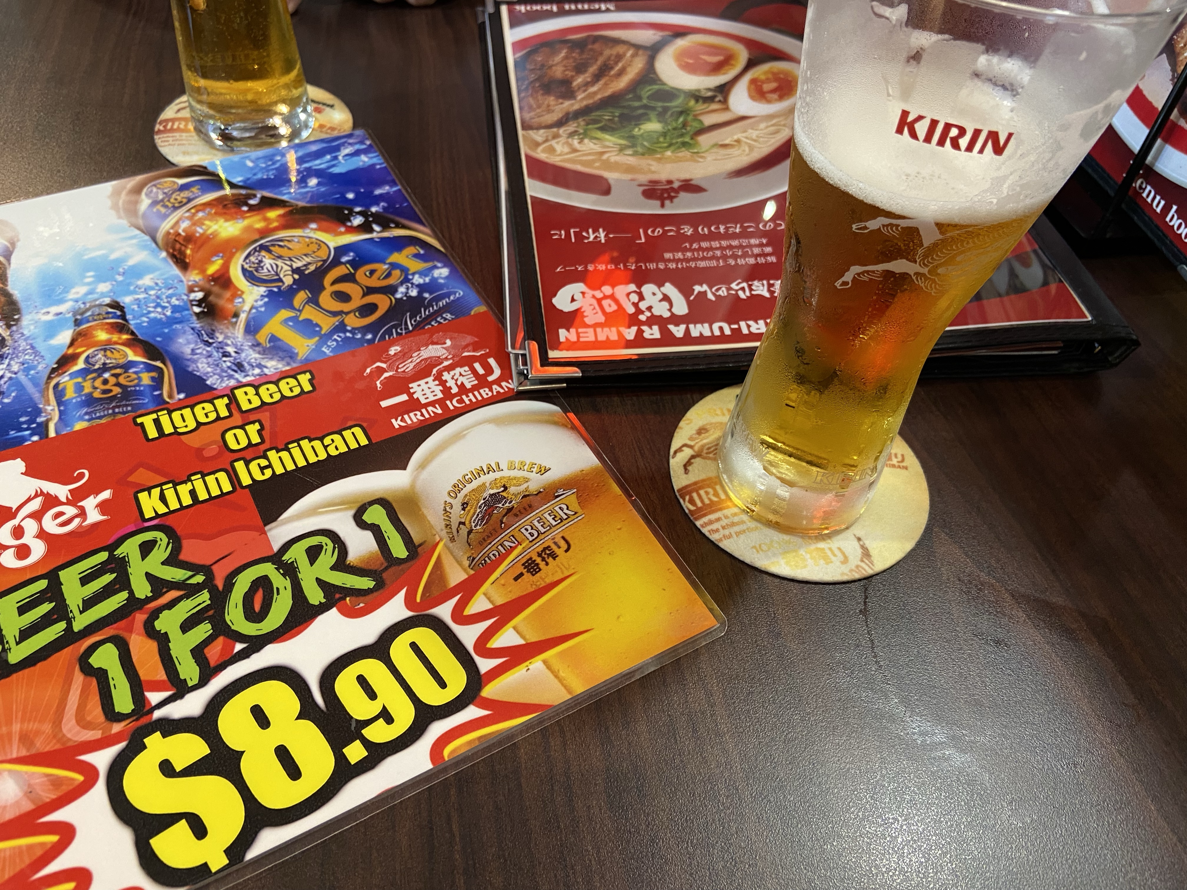 ビールはタイガービア(瓶)またはキリン(ドラフト)。毎日どの時間にいっても1for1が嬉しい。